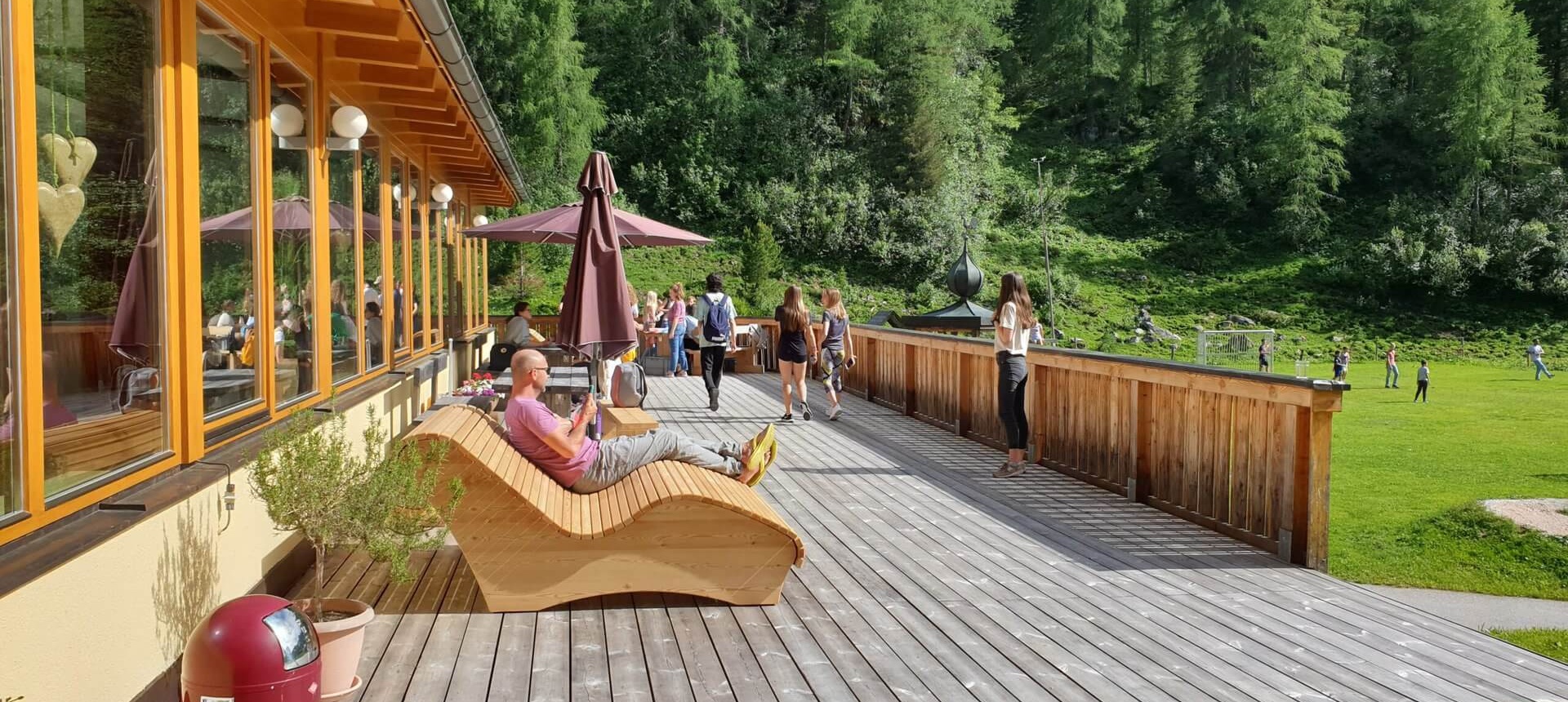 Sonnige Holzterrasse am Jugendhotel Tauernhof, Gäste entspannen, Kinder spielen am Fußballplatz